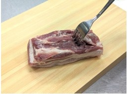 豚バラ塊肉は、味が染み込みやすいように両面をフォークで刺す。 -