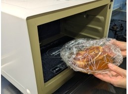 耐熱器に入れ、ふんわりラップをかけて600Wの電子レンジで約4分、上下を返してさらに約3分加熱し、そのまま蒸らしておく。 -