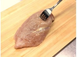鶏胸肉は味が染み込みやすいように、両面をフォークで刺す。 -