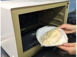 ふんわりラップをかけて600Wの電子レンジで約4分加熱し、そのまま蒸らしておく。 -