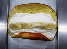 生地を広げ、砂糖を入れて泡立てておいた生クリームの半量とバナナをのせて再び巻く。 -