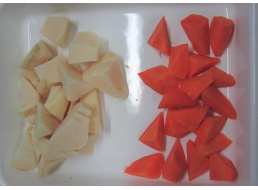 煮汁に筍・にんじんを入れて柔らかくなるまで煮て 丸めた肉団子に片栗粉をまぶして煮汁の中に入れて煮る。 -