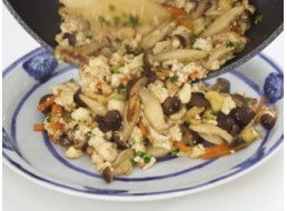 人参はマッチ棒くらいの細切り、しめじは根元を切ってほぐす。 -