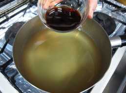 (Bのかえしを作る)本みりんを鍋に入れて火にかけ、沸騰したら砂糖を入れて煮溶かし、醤油を加えて火を止めてかえしを作る。 -